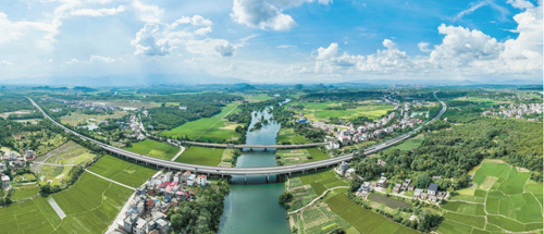 8月24日,道贺高速和207国道道县段,产业基地与村庄、河流相映成景。近年来,该县大力推进交通基础设施建设,加快构建综合交通网络体系,有力推动了当地乡村旅游发展和农产品市场拓展。 蒋克青 摄