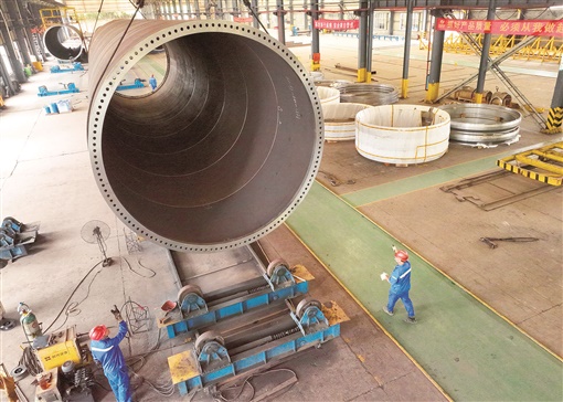 8月28日,衡山县高新技术产业开发区恒岳重钢钢结构工程有限公司,员工在生产风电塔筒装备。今年以来,该公司订单式生产的风力发电机组塔筒设备供需两旺,公司开足马力生产,助力新能源建设与发展。曹正平 陈亮 摄影报道