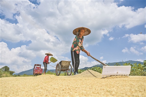 9月9日,双峰县井字镇花山村,农民在晾晒稻谷。时下,该镇正值水稻成熟季节,农民抢抓晴好天气收割、晾晒稻谷。李建新 摄