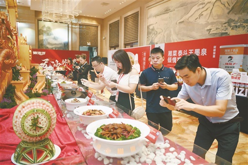 9月10日上午,“辣妹子”京津冀湘菜创新大赛在北京举行,大赛以“创意烹饪”为主题,邀请了京津冀湘菜品牌名厨,根据组委会提供的特色食材或调味品,呈现食材从田间到餐桌的全流程烹制,展示有热情、有朝气、有创造力的湘菜人文之情。图为来宾在欣赏参赛的菜品。