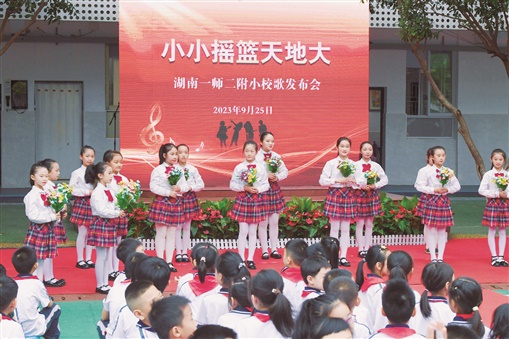9月25日,湖南一师二附小举行校歌《小小摇篮天地大》发布仪式。仪式现场,师生一起唱响校歌,悠扬的旋律回荡在校园的每个角落。