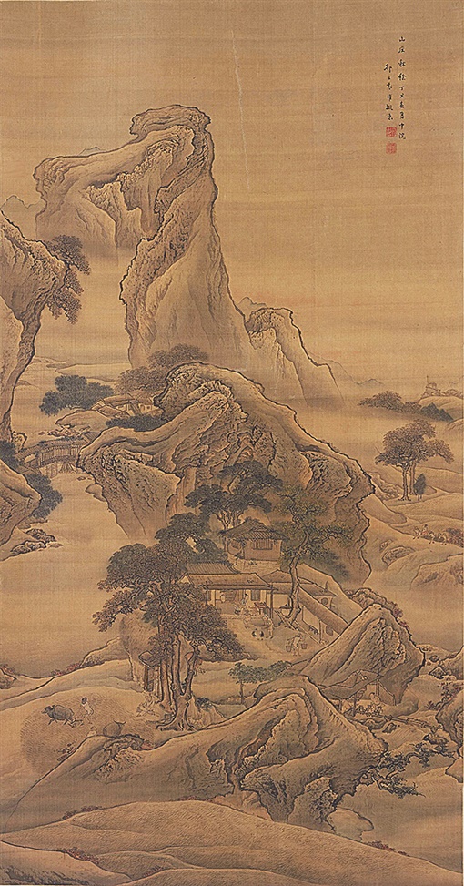 右边的山间小路上有几个行人,两人抬着滑竿,一人坐在上面,后面一个仆人挑担紧随其后。在行人右前方远处的山坡上,依稀可见城郭的一角,左前方的大山深处有一处院落,这几位行人是赶往哪个方向,给人以想象的空间。