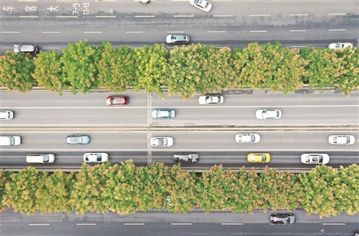 10月9日,长沙市长沙大道(沙湾路口段),绿化带上的栾树进入盛花期,黄花、红果与绿叶交相辉映,成为秋日里一道靓丽风景。