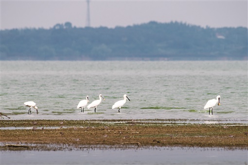 10月9日,临湘市黄盖湖自然保护区,白琵鹭在水边觅食。当地观鸟站工作人员介绍,这是今年抵达黄盖湖的第一批候鸟。陈尚柏 摄