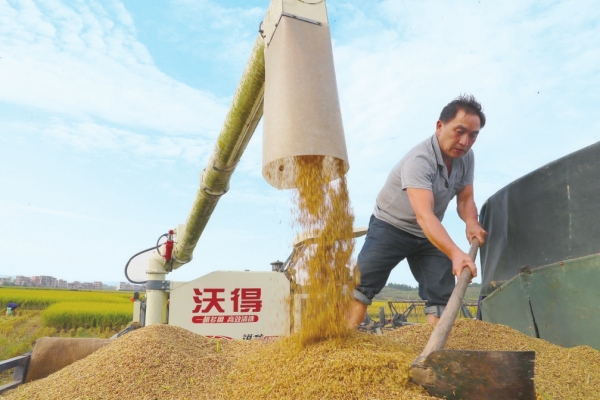 ▲10月14日,新田县三井镇七贤山村,村民在收割水稻。时下,该县晚稻成熟进入收获期,田间地头一派繁忙景象。刘贵雄 陈祉凝 摄影报道
