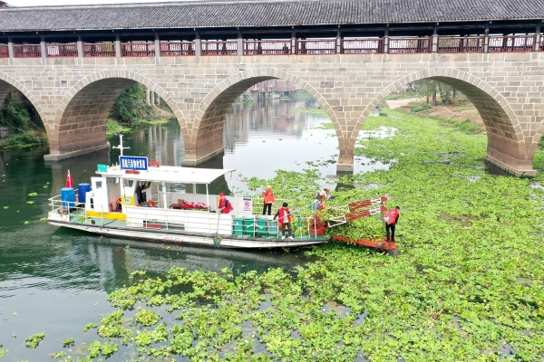 10月13日,祁东县风顺航道维护有限公司工作人员在白河归阳段打捞水葫芦。近期,该县开展专项行动,打捞清理河道水葫芦、水草、漂浮物及沿岸垃圾,打造“河畅、水清、岸绿、景美”的生态环境。陈延上 摄