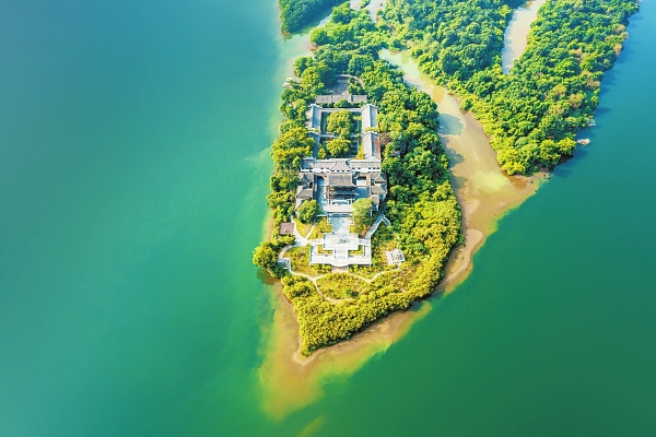 上得岛来,满眼青翠掩映着一处黛瓦白墙、古色古香的仿古院落。抬头可见山门匾额书有“潇湘”,楹联刻着南朝柳恽《江南曲》中的名句:“洞庭有归客,潇湘逢故人。”此联乃当代著名书法家沈鹏所书,其笔风干枯,线条瘦硬,老辣奔放,自成一格。这是吟诵潇湘的优美诗句,昭示着书院与潇湘的相互润养以及深远的内涵。