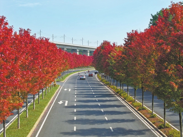 益阳高新区“红枫大道”位于鱼形湖东路,是一条连接高新区和乡村的宽阔道路,全长6.8公里,双向8车道,两边各有一条辅道。2018年,这条道路的3条绿化带栽上了红枫树,截至去年共栽种了近7000棵。红枫树干直立,高达18至27米,枝叶散开呈圆形。秋风起,枫叶红,整条道路宛如3条红色线条,蜿蜒伸向远方,带来强烈的视觉冲击,美不胜收。枫叶红时,微信朋友圈里“红枫大道”美照不断刷屏,这条路也就成为了网红路。