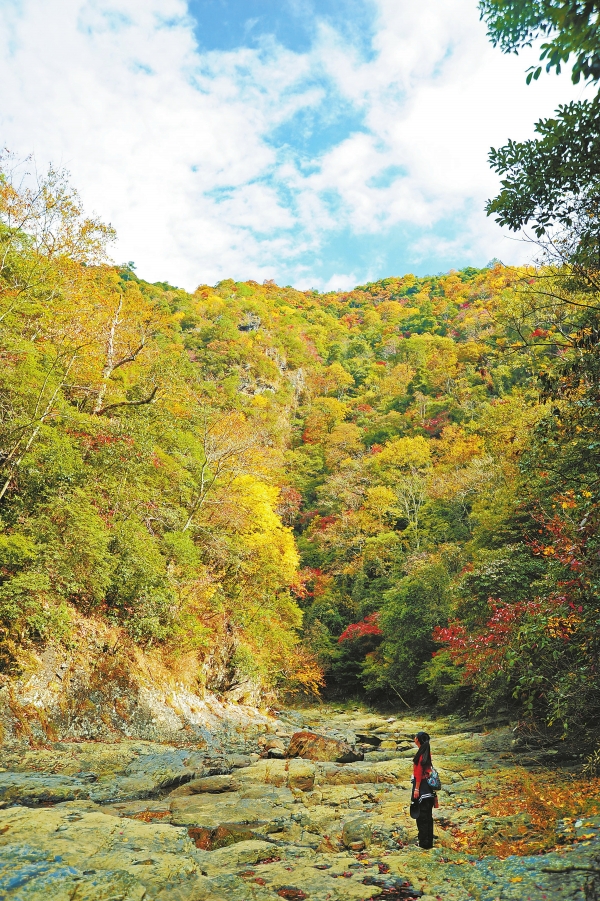 小黄江源地处山间峡谷,长约10多公里,溪流其间,两岸林木茂盛,树叶五彩斑斓,红、黄、蓝、绿、紫等多种色彩的落叶漂浮在溪面。