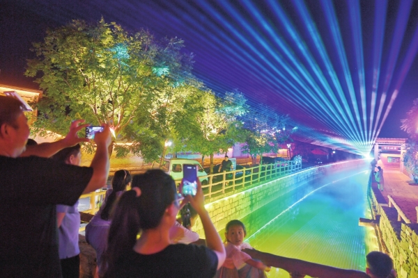 夜幕降临,红旗渠沿线亮起五颜六色的灯光。从7月底开始,村里办起了第一届渠畔灯光节。