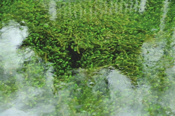 碧泉潭呈圆形,宽约十米,水深约三米,清澈见底,澄碧如玉,一泓泉水从潭底石缝中涌出,携几星小水泡在水面上炸开,一股沁凉之气便扑面而来。潭中墨绿色的纤细水草随着泉水的流动而轻轻摇摆着,像极了一群惬意的游鱼。