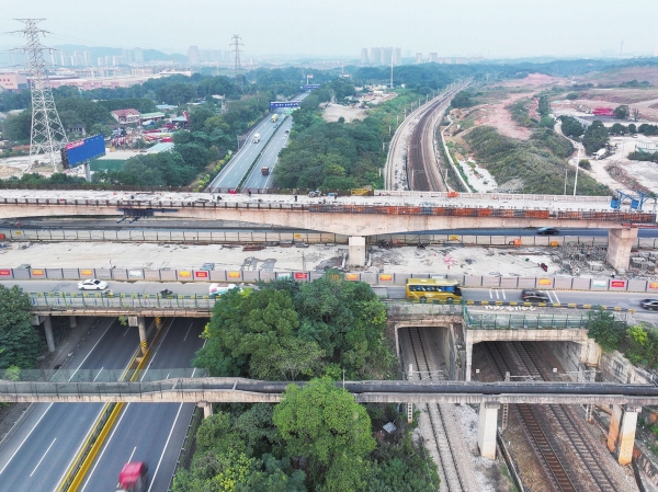 10月29日,长沙地铁1号线北延一期工程金霞站至鹅羊山站高架区间,工人在涉铁段B18-B19中跨施工。目前,该跨已顺利完成合龙,标志着1号线北延一期工程全线正线贯通。 湖南日报全媒体记者 郭立亮 摄