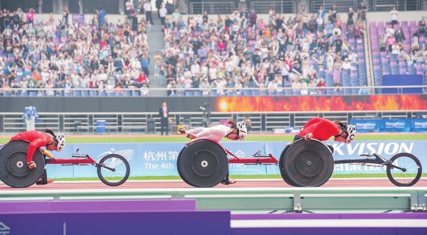 10月26日,杭州黄龙体育中心体育场,田径女子800米T54决赛比赛中,赛场上努力拼搏的选手赢得现场观众阵阵掌声。 |