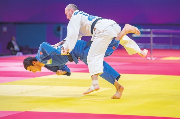 10月23日,萧山临浦体育馆,两名来自乌兹别克斯坦的选手在进行柔道男子J2-60公斤级的冠亚军争夺。 |