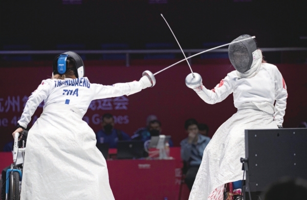 10月26日,杭州电子科技大学体育馆,轮椅击剑项目女子重剑团体金牌赛比赛现场。 |