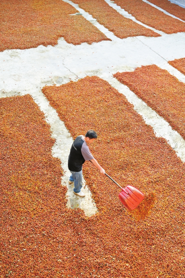 10月31日,双峰县沙塘乡忠实村,村民在晾晒黄栀子。近年,该县大力发展黄栀子种植产业,形成融合农产品加工和旅游观光的绿色产业链,助力农民增收。李建新 摄