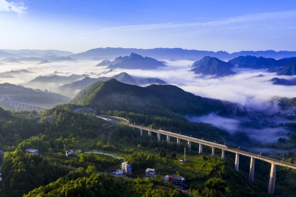湘西大地间,千山万壑、青山绿水间,群鸟飞渡,公路蜿蜒,纵横交错,如河流奔涌向前,美丽而壮观。