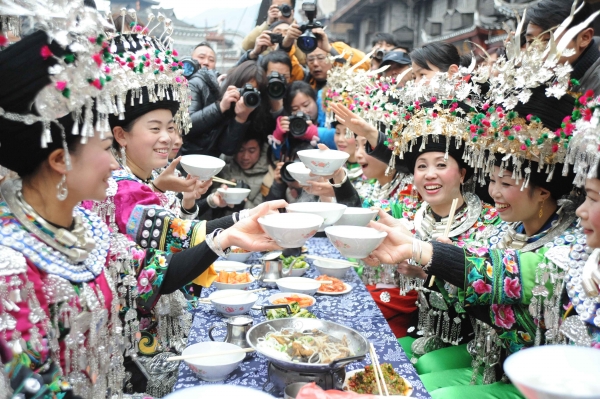 青烟袅袅,中午时分,夯坨村几家农家乐,“云上农家”“云上居”里热闹起来,酸鱼、酸肉、桃花虫等地道苗家美食,陆续摆盘上桌;“云上夯坨当家鸭铺”炒出的农家散养土鸭热气腾腾。美景、美食、古朴的音乐,都成了游人向往的“诗和远方”。