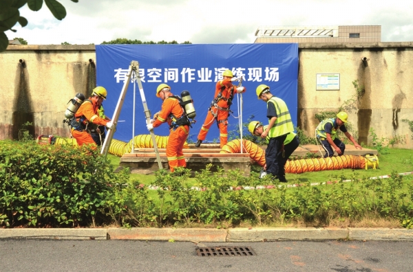 演练中模拟在有限空间作业现场,4名作业人员在进行清水井阀门启闭作业时,因未采取持续送风方式,井下人员在作业中随身佩戴的便携式气体检测仪报警,随后该名工作人员在紧急撤离有限空间时晕倒在井下。