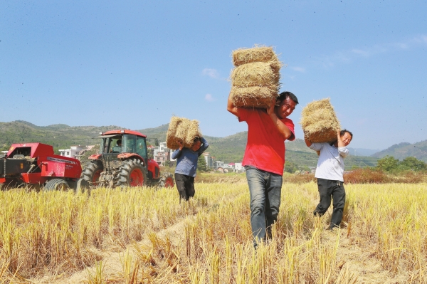 11月2日,新田县骥村镇陆家村,村民在田间开展水稻秸秆回收作业。近年,该县大力推广秸秆回收再利用工作,提高秸秆利用率,增加农民收入,推进农业生态环境持续改善。