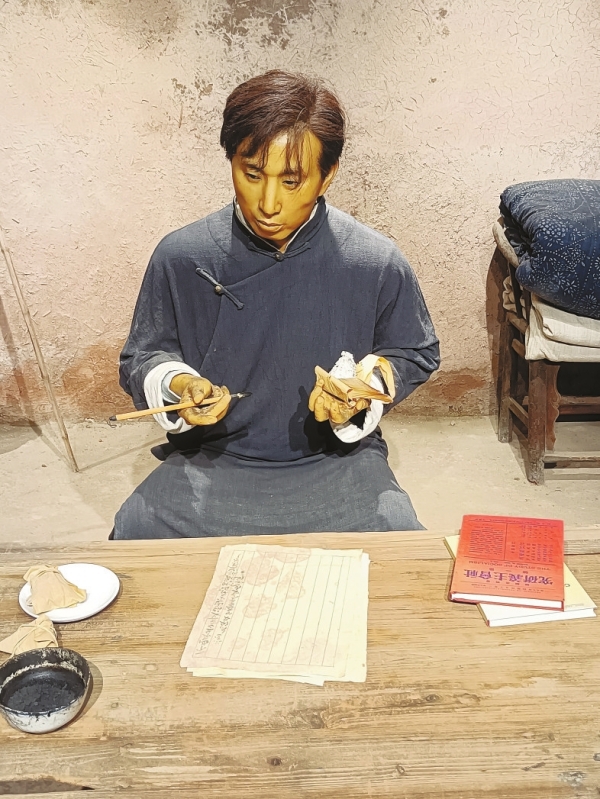 这一场景,领着我的思绪穿越到百余年前的分水塘:1920年的早春,乍暖还寒,时年29岁的陈望道正是躲在这里,翻译了一部“改变19世纪以后人类历史”的经典著作——《共产党宣言》。那个宁静的小山村,给陈望道创造了一个安静的环境,虽然四面透风的柴房挡不住倒春寒的侵袭,但他沉浸其中物我两忘,两耳不闻窗外事,全心扑在译本上,一字一句地斟酌,一字一句地推敲。一段“墨汁当红糖”的佳话流传至今,一天,陈望道正在家里奋笔疾书,妈妈在外面喊道:“你吃粽子要加红糖水,吃了吗?”他说:“吃了吃了,甜极了。”结果老人家进门一看,埋头疾书的儿子,手上、嘴上全是黑墨水。旁边的一碗红糖水,他却一口没喝,反而用粽子蘸着墨水给吃了,但是他浑然不觉,还说:“可甜了,可甜了”。由此就有这样一句话:真理的味道非常甜。