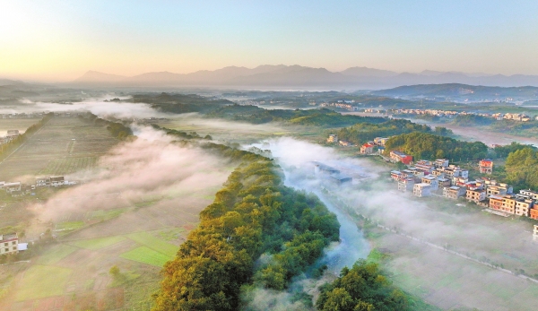 11月17日,常宁市三角塘镇长江村,田园、村庄、道路、远山与晨雾交相辉映,如梦如幻,美不胜收。刘东华 摄