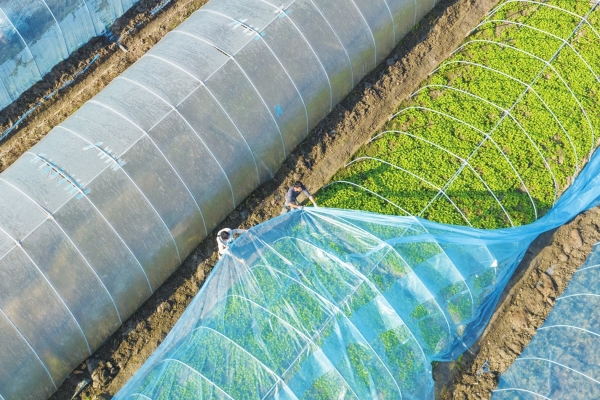 11月21日,娄底经开区大埠桥办事处宋家村,村民在覆盖蔬菜大棚薄膜。近期,冬季农作物田间管理进入关键期,种植户抢抓农时,精心做好蔬菜的管护。吴永华 摄