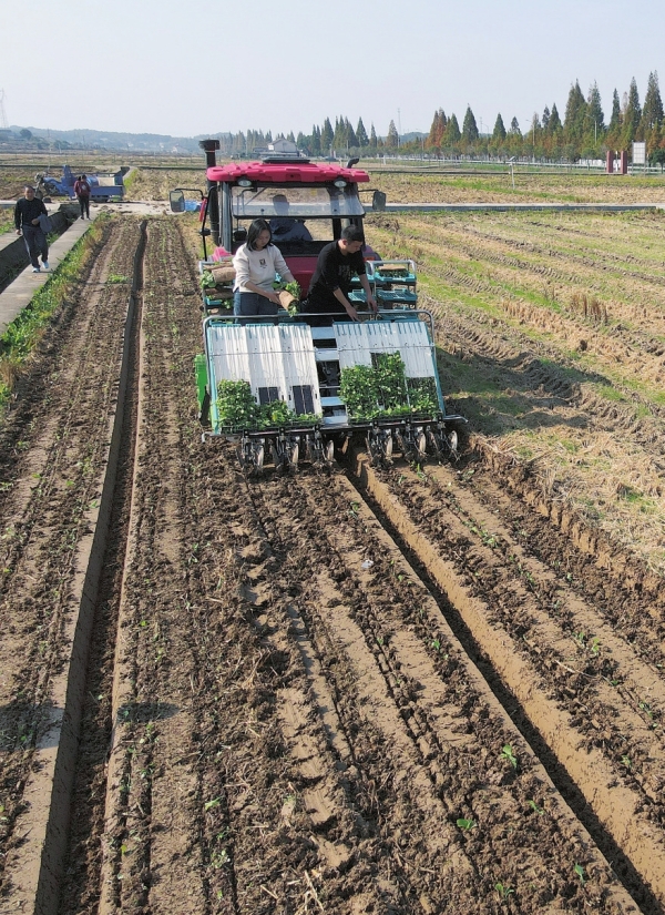 连日放晴,田里的水已晒干,正是油菜机械化移栽的好时节。