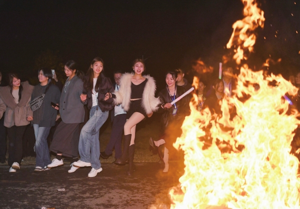 11月25日晚,平江县山润小镇,人们围着篝火欢快起舞。当晚,承办2023第十三届世界旅游文化小姐大赛湖南总决赛的平江山润小镇文化旅游有限公司举办篝火文艺晚会,世界旅游文化小姐参赛选手及游客等500余人相聚齐欢,享受周末夜生活。 湖南日报全媒体记者 傅聪 摄
