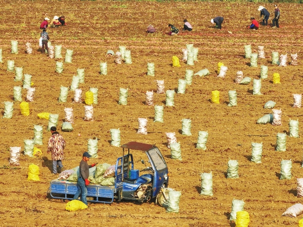11月27日,道县祥霖铺镇下蒋村,村民趁晴好天气抢收红薯。时下,该县种植的“订单红薯”迎来收获季,田间地头一派繁忙。蒋克青 摄