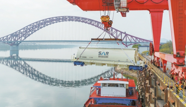 12月13日,株洲港建霞作业区,中车长江集团株洲车辆有限公司生产的磷酸盐漏斗车,准备通过水运出口沙特阿拉伯。本次出口外运的磷酸盐漏斗车总计200辆,可实现全天候无人操作自动化装卸货和实时监控,大大提高运输效率。
