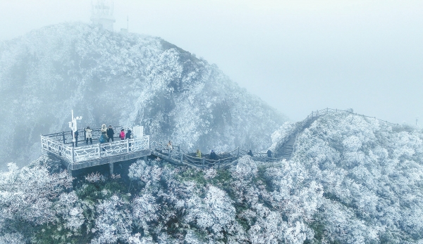 宜章县莽山旅游区近日迎来今冬首场雾凇,漫山遍野银装素裹,宛如琼树银花,妖娆多姿美不胜收,吸引众多游客前来打卡。邓文超 摄