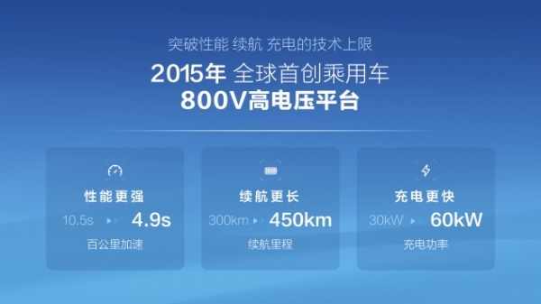 在新能源汽车普及初期,为了突破动力、续航、充电等方面的技术上限,给用户创造更极致的电动车体验,电动车高压化的技术突破势在必行。比亚迪率先在2015年实现突破,全球首创乘用车800V高电压平台,搭载在秦EV(2015款)、唐DM(2015款)等车型上。该技术可实现百公里加速快至4秒级,纯电续航里程可达450公里、快充功率提升至60千瓦,全方面升维用户体验。比亚迪800伏高电压平台超前行业2-3代,当时,市面上的乘用车都是低电压,只有比亚迪是高电压。时至今日,行业竞相进入800伏高电压平台赛道。