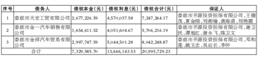 债权金额:截至2023年11月20日,娄底市天宏工贸有限公司等3户不良债权本金人民币7,329,585.7元,利息人民币13,666,143.53元,债权合计人民币20,995,729.23元。(如本金、利息数据与相关合同、借据、法院判决不一致的,以相关合同、借据、法院判决为准)