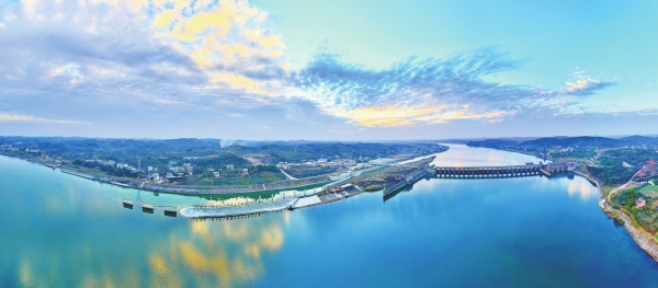 12月25日,湘江常宁市新河镇段,清澈的江水与蓝天、彩云、水闸和两岸民居交相辉映。