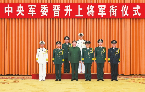 上午11时许,晋衔仪式在庄严的国歌声中开始。中央军委副主席张又侠宣读了中央军委主席习近平签署的晋升上将军衔命令。中央军委副主席何卫东主持晋衔仪式。