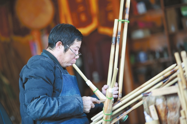 12月25日,通道侗族自治县双江镇萨岁广场非遗就业工坊,工匠在制作芦笙。近年来,该县持续推动非物质文化遗产保护、传承与发展,助力群众增收。