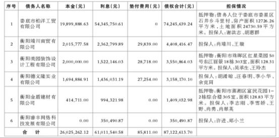 债权金额:截至2023年11月20日,娄底市柏洋工贸有限公司等6户不良债权本金人民币26,025,262.12元,利息人民币61,011,540.58元,垫付费用人民币85,811.00元,债权合计人民币87,122,613.70元。(如本金、利息数据与相关合同、借据、法院判决不一致的,以相关合同、借据、法院判决为准)