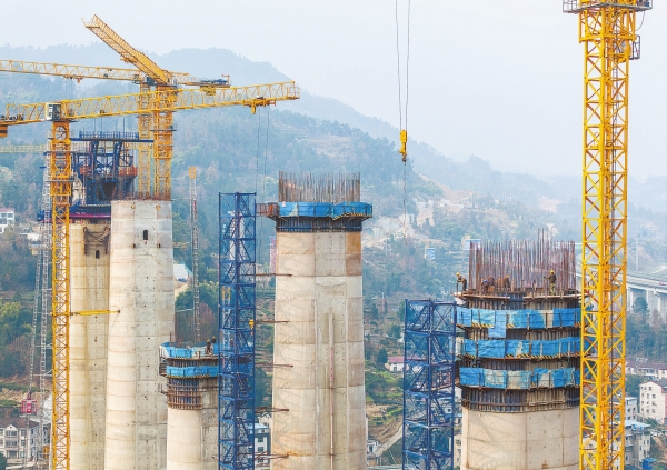 2023年12月31日,在湖北省宜昌市秭归县茅坪镇溪口坪村,中铁三局的工人在三峡枢纽茅坪港疏港铁路建设工地忙碌(无人机照片)。元旦假期期间,各行各业的劳动者坚守岗位,在一线忙碌。