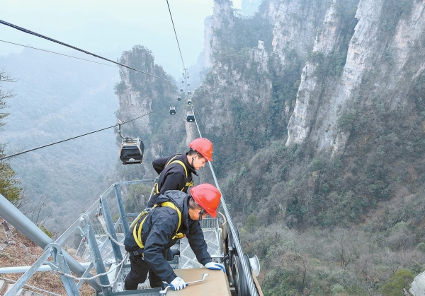 1月1日,张家界国家森林公园天子山索道,工人在检查索道运行情况。新年第一天,张家界国家森林公园的众多劳动者坚守在旅游服务保障一线,在忙碌中度过元旦。