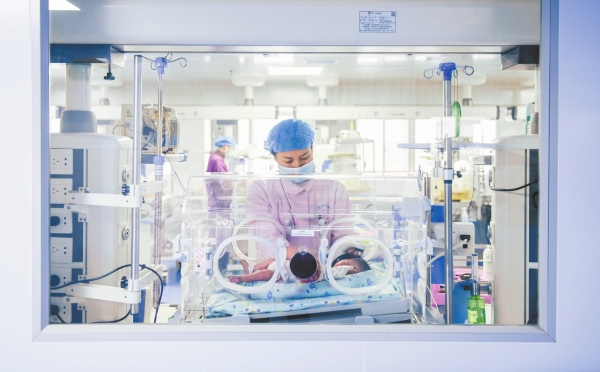 1月1日,医护人员在道县人民医院新生儿科进行新生儿护理。新年第一天,当地不少劳动者坚守岗位,在忙碌中度过元旦。蒋克青 柏华林 摄影报道