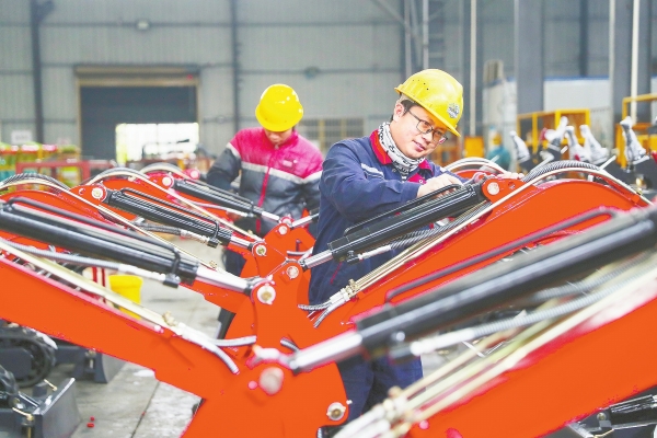 1月2日,新田县产业开发区湖南德力重工有限公司生产车间,工人在赶制微型挖掘机国内外订单产品。新年首个工作日,该开发区众多企业加紧生产,力争新年“开门红”。