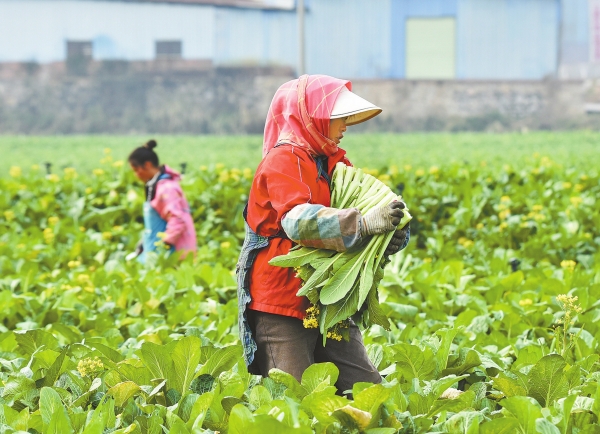 1月1日,嘉禾县晋屏镇下车村,村民在田间采收蔬菜。元旦假期,正值冬季蔬菜争“鲜”上市好时节,当地村民抢抓晴好天气,及时采摘蔬菜,销往各地农贸市场。黄春涛 摄