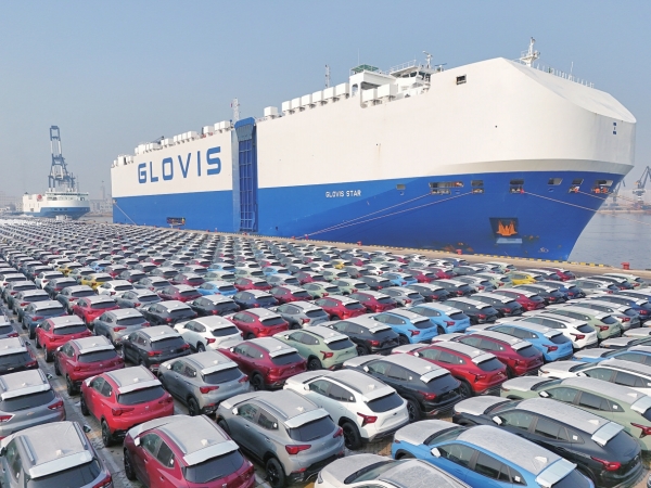 新年伊始,各大港口货轮进出,各作业码头运输车辆穿梭如织,货物进出繁忙。1月2日,汽车在山东港口烟台港集结等待装船出口(无人机照片)。