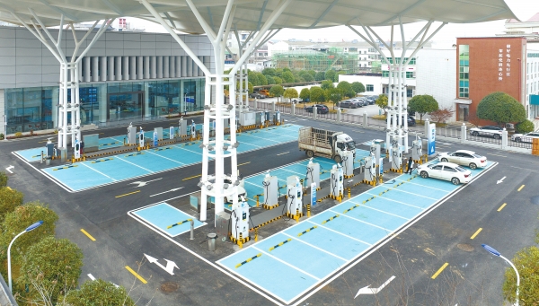 1月9日,新能源汽车在长沙县㮾梨充电站充电。该站是湖南省首座集光伏、储能系统、液冷超充、车辆检测等功能于一体的充电站,日前正式投入使用,22个充电桩可同时为40台电动汽车提供服务。该站是湖南新能源汽车产业发展科技创新应用示范基地,助力全省新型电力系统建设。