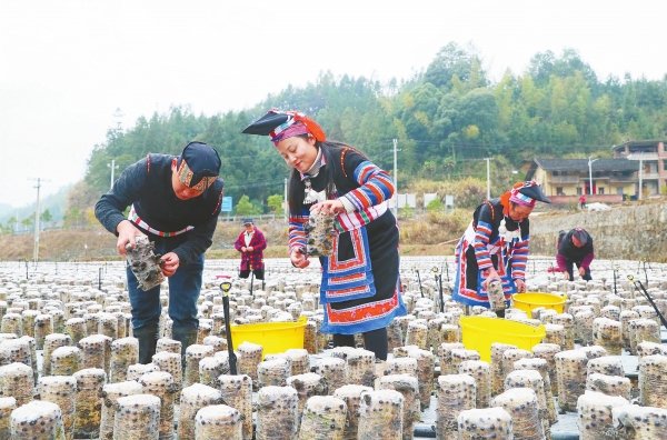 1月11日,新田县门楼下瑶族乡竹林坪村,村民在采收木耳。近年,该乡利用大瑶山良好的生态环境,引导瑶民发展黑木耳种植,壮大集体经济,实现稳定增收。刘贵雄 雷风德 摄影报道