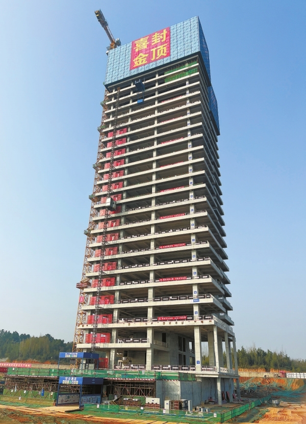 1月12日,天气放晴。支模、绑扎钢筋、混凝土浇筑……当天上午,记者来到120米高的湘江新区九华片区科创中心项目楼顶,60多名工人正在紧张施工,塔吊繁忙作业,现场建设如火如荼。