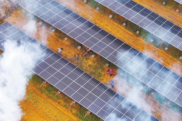 1月12日,通道侗族自治县双江镇长安堡村光伏发电基地,村民在光伏板下劳作,为种植茶叶做准备。近年,该县在大力发展光伏发电、风力发电、化学储能等新能源产业的同时,积极引导发电企业利用发电设备下空闲土地开展规模化种植、养殖,提高土地利用率,助力周边村民增收。李尚引 摄