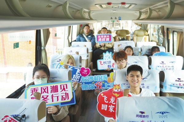 1月12日,湖南大学天马学生公寓门口,大学生在免费机场大巴上合影。寒假临近,湖南机场集团结合高校师生假期出行需求,在长沙部分高校及机场推出免费机场大巴、航站楼高校师生值机专柜、快速安检通道等服务举措,让师生实现“校门口”到“登机口”零换乘,享受全流程便捷服务。