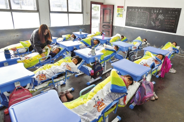 1月12日,浏阳市龙伏镇黄桥完全小学,一年级学生使用可躺式课桌椅午休。今年开始,该校添置一批可躺式课桌椅,展开后可变成午睡床,学生由“趴着睡”改为“躺着睡”,大大提高了午休质量。湖南日报全媒体记者 童迪 通讯员 李圣景 摄影报道